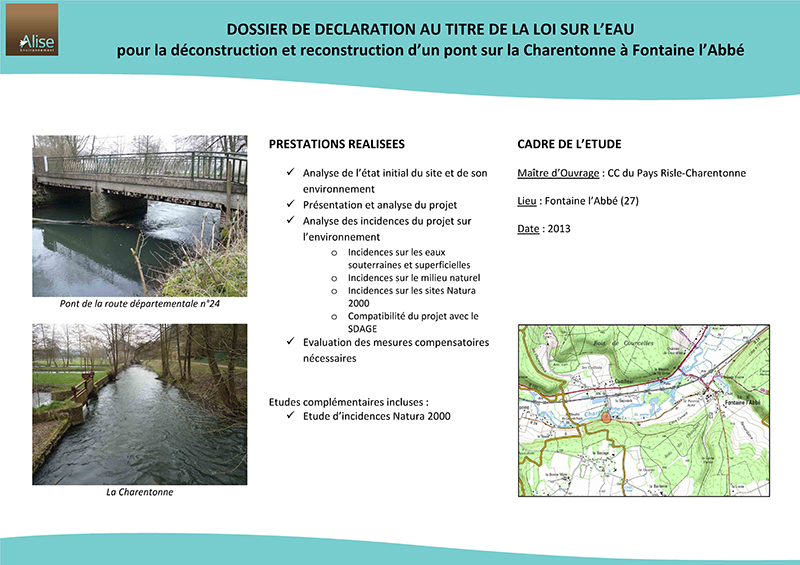 ALISE réalise régulièrement des dossiers réglementaires au titre de la loi sur l’eau, dans le cadre de différents projets d’aménagement définis à l’article R 214-1 du code de l’environnement relatif à la nomenclature des opérations soumises à autorisation ou à déclaration.